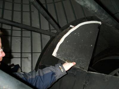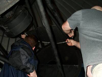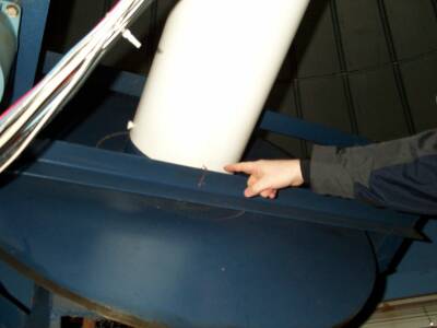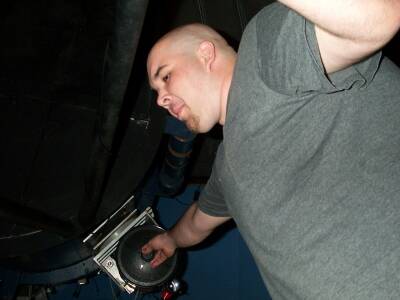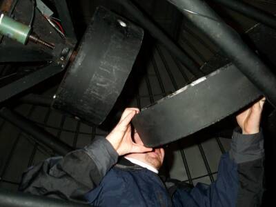 Take the lenscap off of the 8-inch finderscope. You will have to lean over the edge of the platform to do this. Use the telescope for balance.