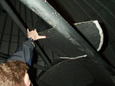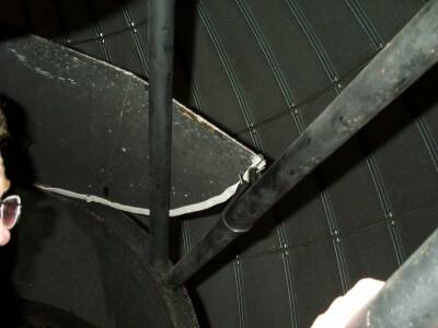 Look up at where the white telescope apparatus meets the round blue panel above the TV cart. The line on the apparatus should be in line with the rusty nail. If it is not aligned, use the hand paddle to correct it.